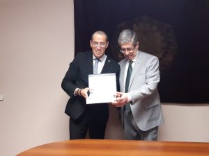 Fue D. Jorge Martínez Acinas, como colegiado más antiguo de la institución y actual Defensor de la Ciudadanía de la ciudad de Segovia, quien hizo entrega a D. José Luis Benito, presidente del Colegio de Graduados Sociales de Segovia, de la placa conmemorativa.